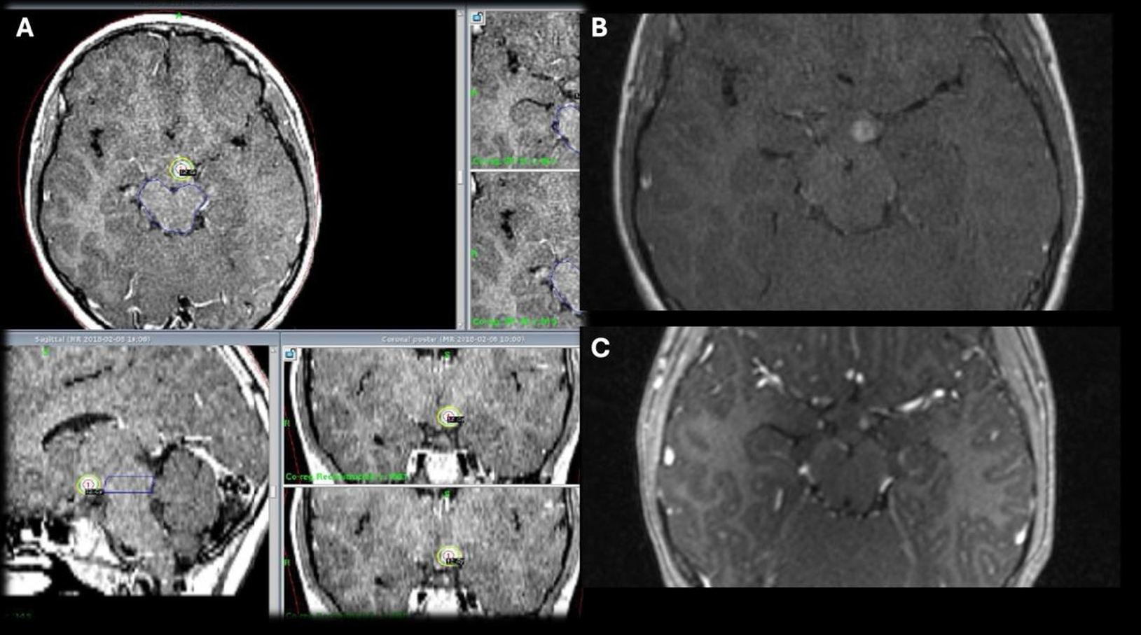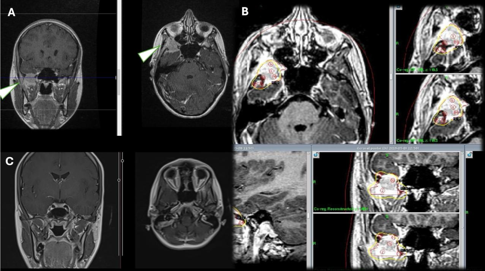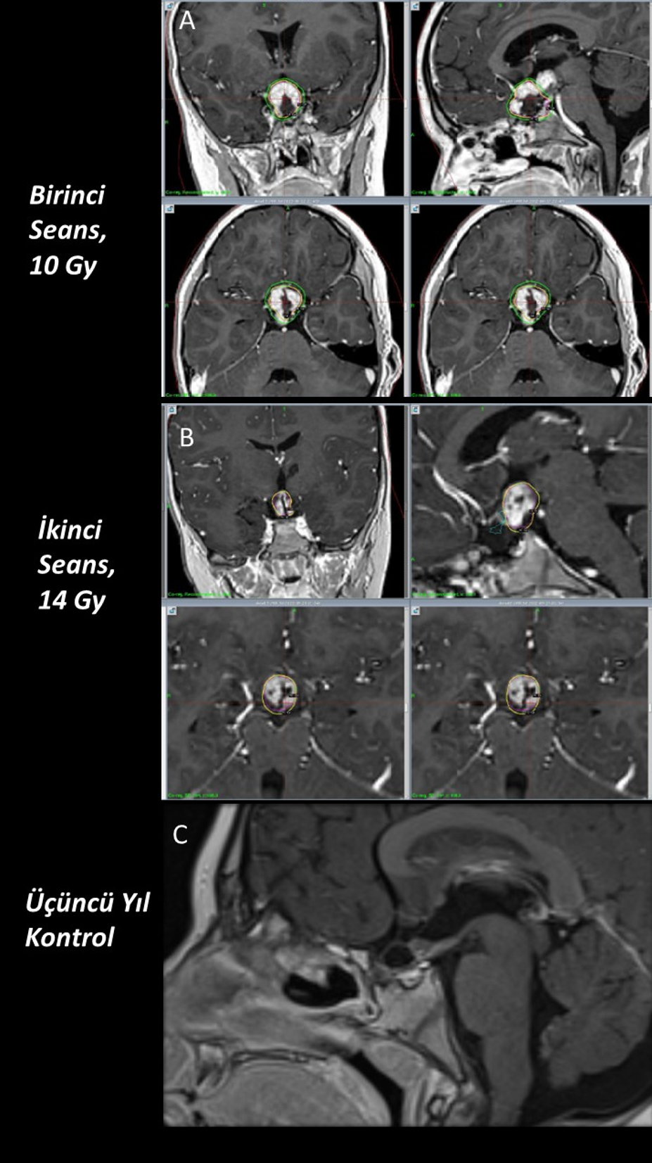 Kraniofarengiom tanılı iki erkek hastadan ilki 7 yaşında olup cerrahi patolojisi adamantinamatöz kraniofarengiom olarak sonuçlanmıştır. Önce transkraniyal, 4 ay sonra transsfenoidal yolla cerrahi yapılan hastaya ilk ameliyatının 6. ayında rezidü kitle nedeniyle GKRC uygulandı. 9. ayında kitlenin kistik komponenti için cerrahi yapılan hastanın 12 aylık takibi sonucunda kitlenin kaybolduğu görüldü. Diğeri hasta ise 6 yaşında olup transsfenoidal yolla 2 kez ameliyat edilmiş ve rezidü kitlesine yönelik hacim bölünerek 2 seans GKRC yapıldı (Şekil 4). 37 aylık takipte kitlenin kaybolduğu tespit edilmiştir.