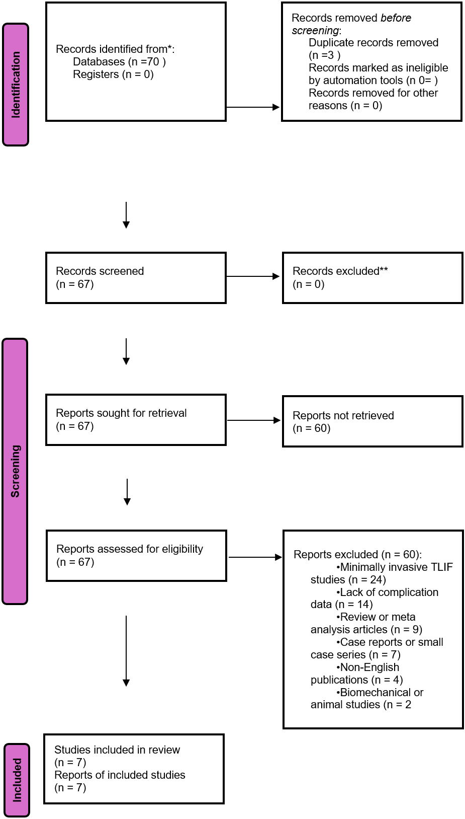 Literatür taraması sonucunda veri tabanlarından toplam 70 kayıt elde edilmiştir. Üç yinelenen kayıt çıkarıldıktan sonra 67 çalışma başlık ve özet düzeyinde taranmıştır. Tüm bu çalışmaların tam metinleri değerlendirilmiş ve 60 çalışma çeşitli nedenlerle dışlanmıştır. Dışlama nedenleri arasında minimal invaziv TLIF çalışmalarının yer alması, komplikasyon verilerinin rapor edilmemesi, derleme veya meta-analiz çalışmaları, olgu sunumları veya küçük olgu serileri, İngilizce olmayan yayınlar ile biyomekanik veya hayvan çalışmaları bulunmaktadır. Sonuç olarak 7 çalışma meta-analize dahil edilmiştir. Çalışma seçim süreci Şekil 1’de gösterilmiştir. Meta-analize dahil edilen çalışmalar incelendiğinde, açık TLIF cerrahisinin farklı hasta popülasyonlarında değerlendirildiği görülmektedir. Takahashi ve ark. tarafından yapılan çalışma erken dönem klinik sonuçları ortaya koymuştur.9 Lau ve ark. minimal invaziv ve açık teknikleri karşılaştırmıştır.10 Wang ve ark. benzer şekilde klinik sonuçları değerlendirmiştir.11 Adogwa ve ark. prospektif tasarımda sonuçları incelemiştir.12 Serban ve ark. randomize çalışma ile karşılaştırmalı veriler sunmuştur.13 Abbasi ve ark. obez hastalarda sonuçları değerlendirmiştir.14